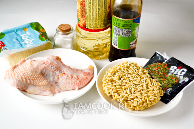 Соберите продукты для приготовления рамена с сыром и курицей. Вместо сыра тофу можно взять обычный твердый сыр или плавленый.