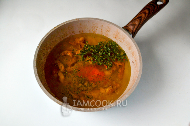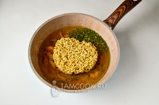 Затем в сковороду с обжаренным куриным мясом влейте горячую воду, добавьте соус и суповую приправу, которая идет к лапше, поперчите и доведите до кипения.