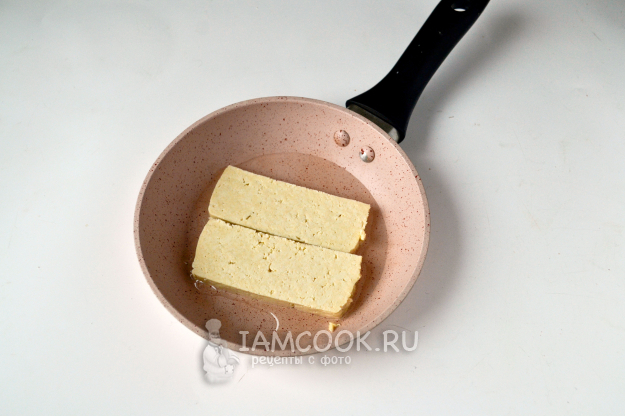 Тофу нарежьте ломтиками, положите на разогретую с растительным маслом сковороду.