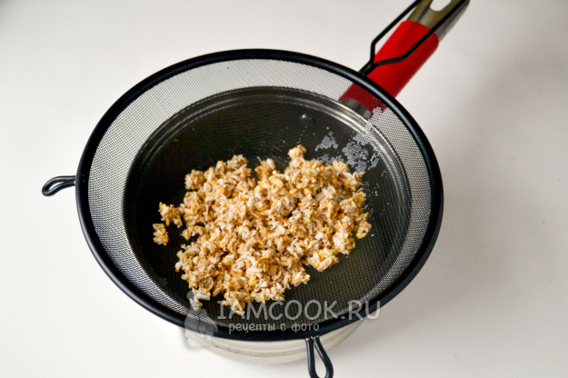 Спустя указанное время процедите овсяную массу через дуршлаг. Хлопья слегка отожмите ложкой.