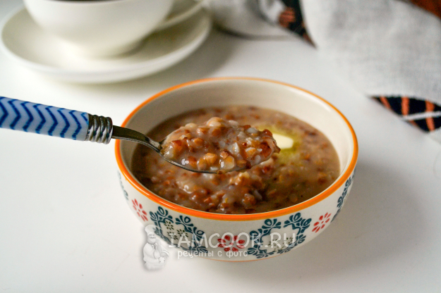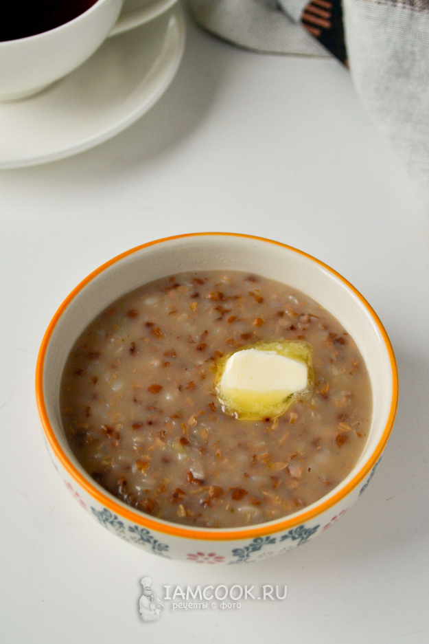 Гречневая каша на овсяном молоке готова. Подавайте ее к столу горячей со сливочным маслом.