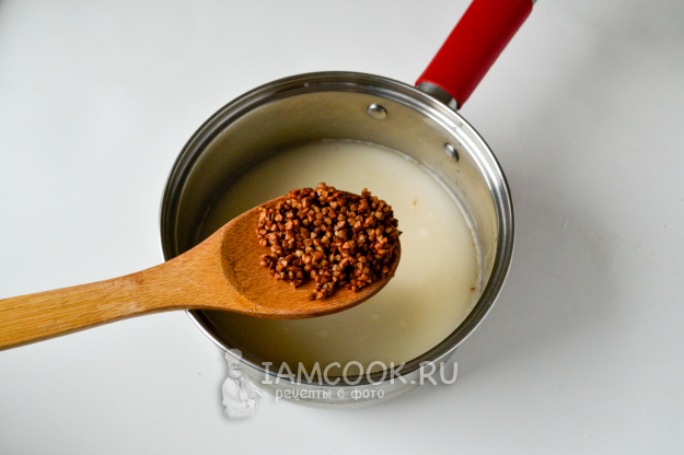 Гречневую крупу промойте в нескольких водах и добавьте в сотейник с овсяным молоком. Поставьте сотейник на огонь. Первые несколько минут нагрева перемешивайте содержимое, чтобы не пригорело, так как овсяная масса хорошо оседает на дно посуды.