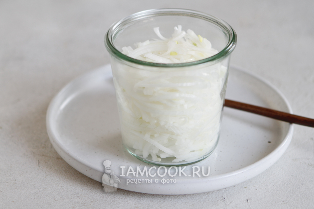 Маринад перелейте в банку с луком. Банку закройте крышкой и оставьте на столе на 25-30 минут.