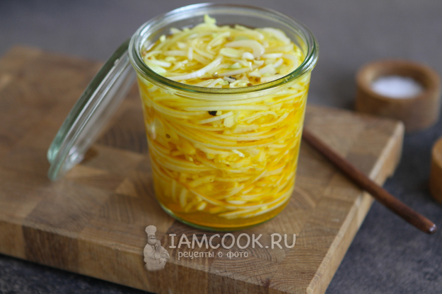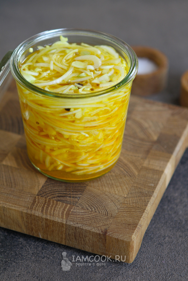 Через 25-30 минут маринованный лук с куркумой будет готов. Используйте его по назначению.