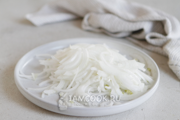 Почистите две крупные луковицы. Нарежьте лук полукольцами или кольцами.