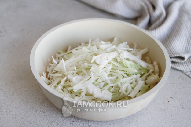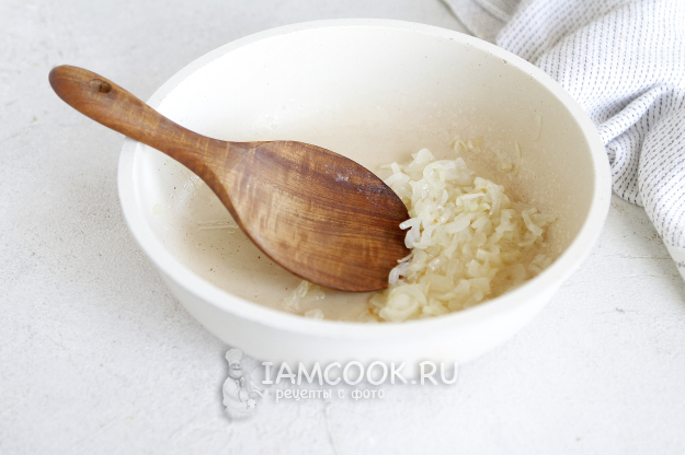 Почистите лук, нарежьте его полукольцами или кубиком. Капусту мелко нашинкуйте. Разогрейте в сковороде растительное масло и припустите лук до мягкости.