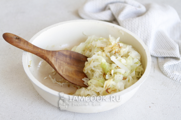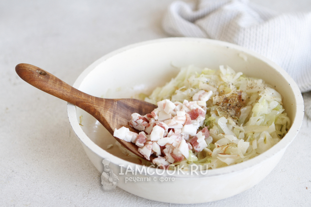 Как только капуста будет готова, слегка посолите, поперчите и добавьте кусочки сала. Перемешайте, выключите огонь и оставьте капусту под крышкой на 10 минут. Начинку хорошо остудите.