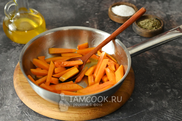 Поскольку тыква твёрже стручковой фасоли, то её нужно начать готовить чуть раньше. Поэтому разогрейте в сковороде масло, отправьте в сковороду брусочки тыквы и на среднем огне обжаривайте её до полуготовности, примерно 8-10 минут. Периодически помешивайте, сковородку крышкой не накрывайте.