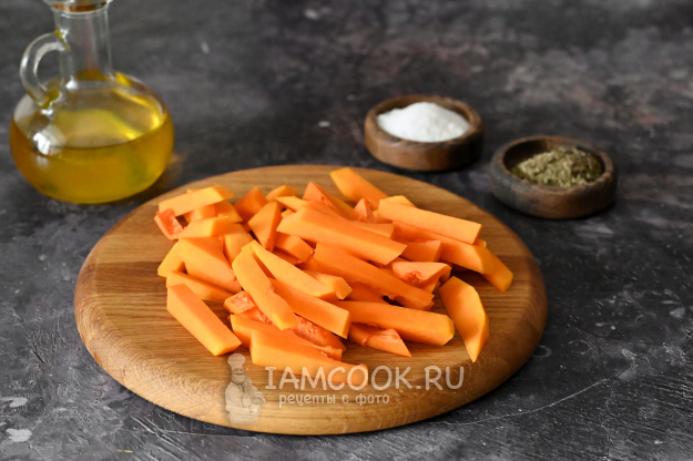 Тыкву очистите от семян и кожуры и нарежьте брусочками, чтобы они по конфигурации плюс-минус совпадали со стручковой фасолью.