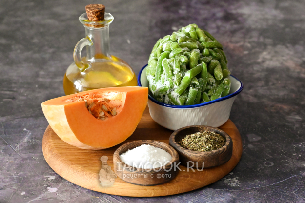 Соберите необходимые продукты для приготовления стручковой фасоли с тыквой на сковороде.