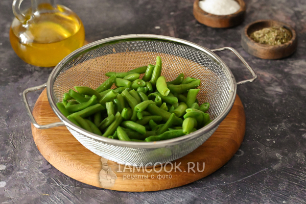 Если у вас в сезон будет свежая стручковая фасоль, то просто отрежьте у неё кончики, нарежьте на кусочки и далее используйте по рецепту, отваривать не нужно.