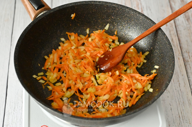 А в сковороду отправьте лук с морковкой и обжарьте их до лёгкого золотистого цвета (огонь можно чуть убавить). Если необходимо, то капните ещё немного масла.