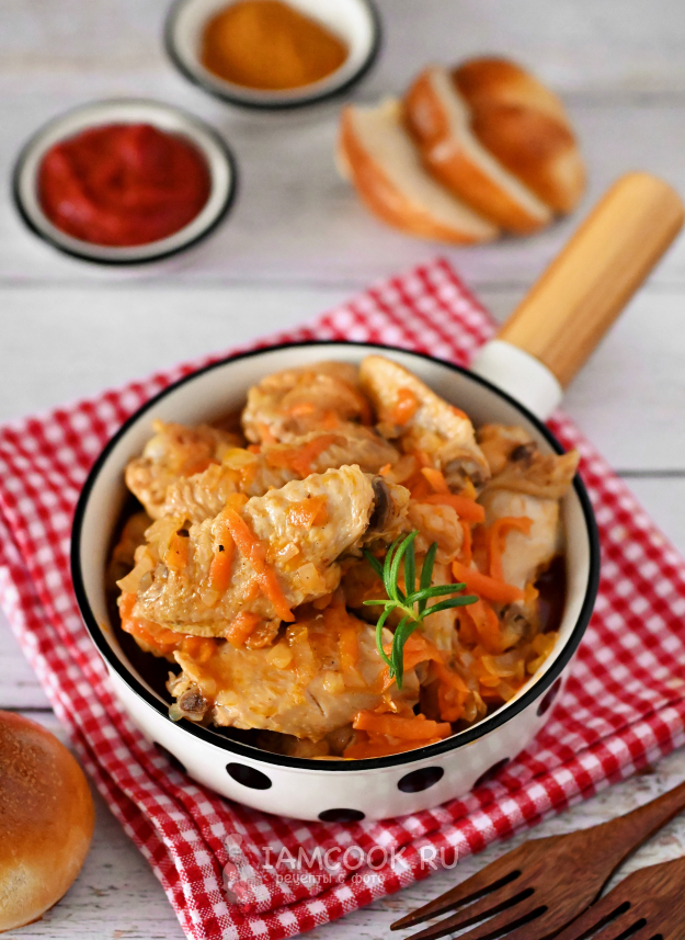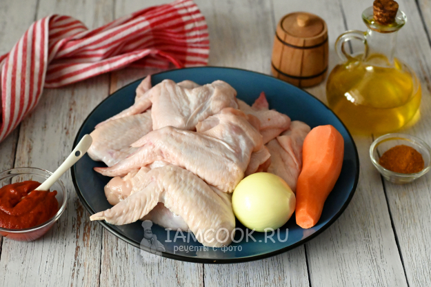 Соберите все необходимые продукты для приготовления вкусных тушеных куриных крылышек с подливкой на сковороде.