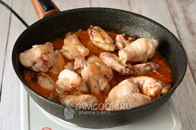Доведите подливку до кипения и отправьте в неё обжаренные крылышки. Перемешайте, накройте сковородку крышкой и тушите куриные крылышки в подливке до готовности (примерно полчаса). Время условное, всё зависит от того, насколько мягкое мясо вы любите.