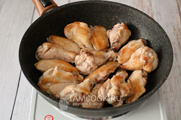 На самом сильном огне обжарьте куриные крылышки с двух сторон до румяной корочки. Примерно по 3-5 минут с каждой стороны.