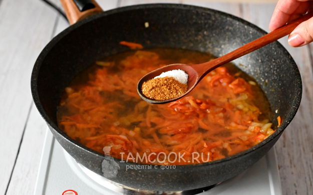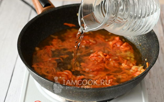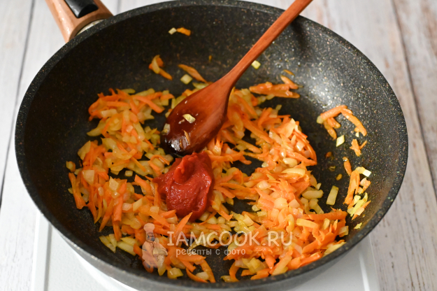 Затем добавьте томатную пасту и обжарьте её вместе с луком и морковью.
