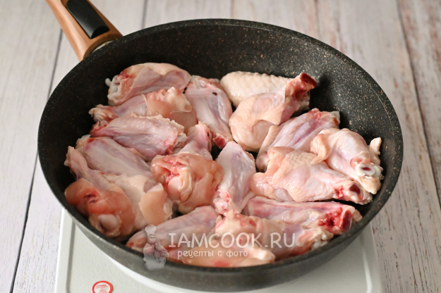 Разогрейте в сковороде растительное масло на сильном огне. Выложите в сковородку разрезанные крылышки.