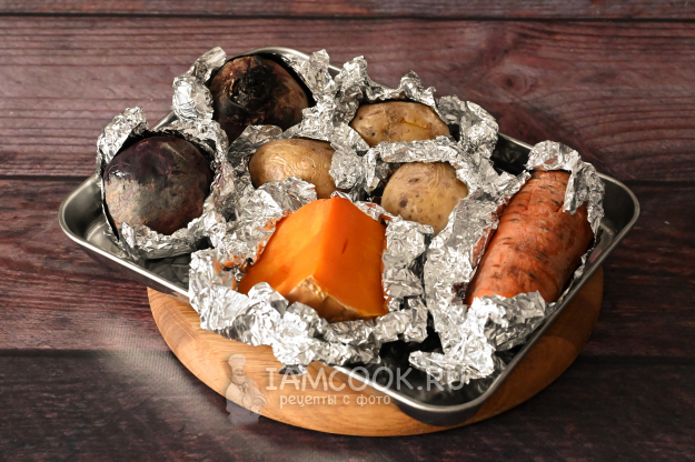 Для запекания берите овощи некрупные, чтобы они запекались недолго. В крайнем случае корнеплод можно разрезать на 4 части и каждую завернуть в фольгу по отдельности, так будет быстрее.