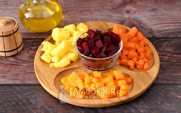Нарежьте картофель, свеклу, морковь и тыкву небольшими кубиками.