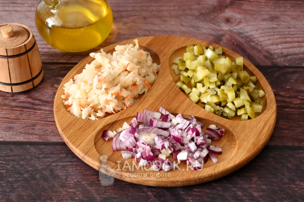 Также кубиками нарежьте солёные огурчики, мелко нарубите лук. Квашеную капусту отожмите от рассола и тоже нарежьте помельче.