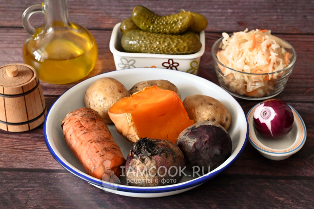 Вот такой набор продуктов понадобится, чтобы приготовить винегрет с тыквой.