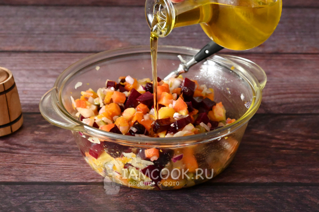 Соедините все овощи в миске, посолите по вкусу и полейте ароматным подсолнечным маслом! Если не хотите, чтобы свекла сразу окрасила все овощи в красный цвет, её можно заправить маслом в отдельной мисочке и потом добавить в винегрет.