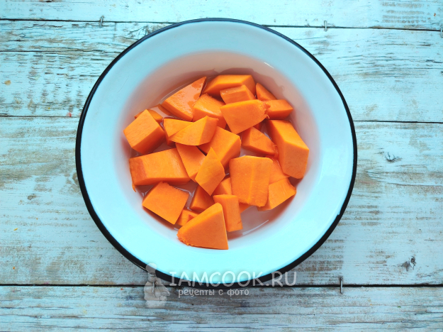 Тыкву почистить, нарезать на кубики, поместить в огнеупорную посуду, поставить на огонь, влив воду.