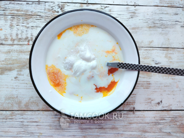 Добавить в овощное пюре кефир комнатной температуры, сметану, соль. Поставить на медленный огонь.