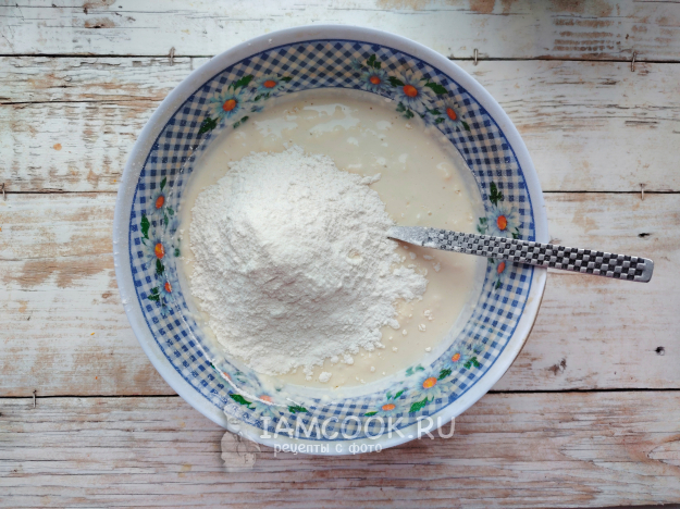 Яйцо разболтать вилкой, влить в опару. Всыпать просеянную муку, добавлять муку частями, каждый раз тщательно промешивая массу ложкой.