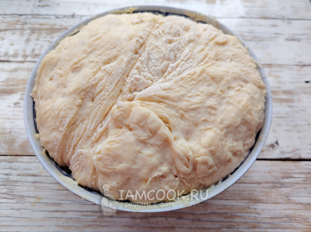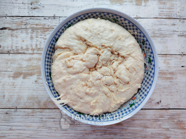 Замесить плотное тесто, но не забивать его сразу мукой, чтобы оно могло свободно «расти». Накрыть посуду полотенцем или пищевой пленкой и оставить на пару часов. За это время несколько раз обмять тесто, чтобы воздух вышел, тесто стало воздушным.