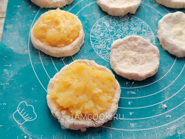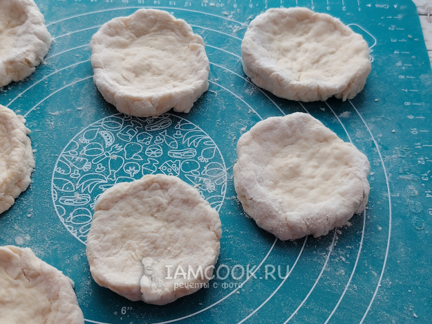 Готовое тесто разделить на кусочки, на подсыпанной рабочей поверхности раскатать каждый кусочек в лепешку.