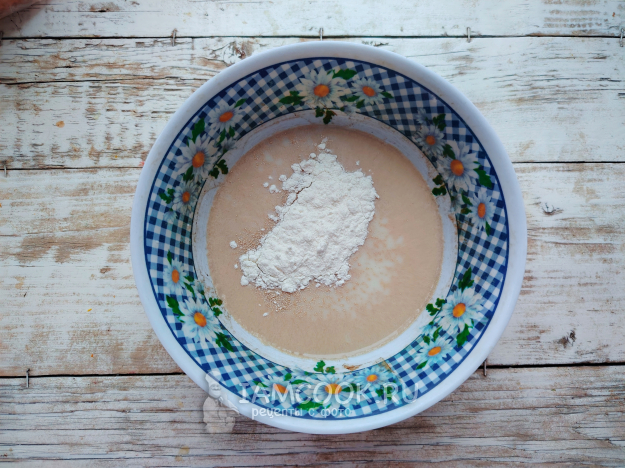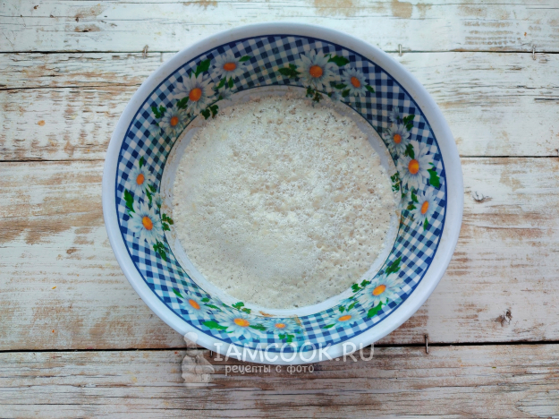 Перемешать. Оставить смесь в теплом месте на 15 минут, тем временем просеять муку. На поверхности опары должна образоваться объемная пенка.