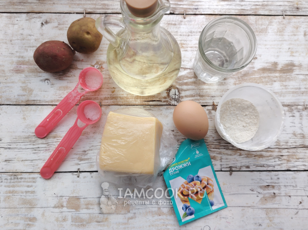 Чтобы приготовить вкусные шаньги с картошкой и сыром, нам потребуются продукты из списка ингредиентов. Сыр подойдет любой твердый, лучше взять продукт без особо ярких вкусовых добавок, чтобы не заглушить вкус картофеля.