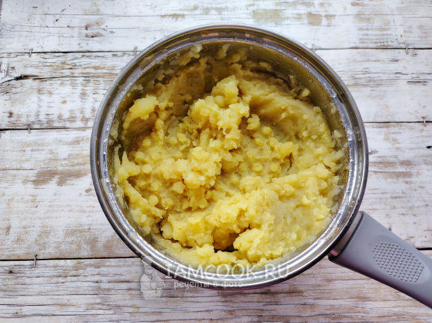 Параллельно подготовить начинку. Картофель почистить, разрезать на части, отварить в подсоленной воде. Сделать из картофеля пюре, оставив немного отвара в кастрюле с картошкой, чтобы пюре не получилось слишком сухим. Добавить масло сливочное.