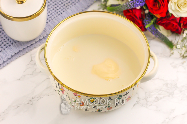 Перелейте сливки в кастрюлю или ковш, выложите туда же плавленый сыр и всыпьте сахарный песок.