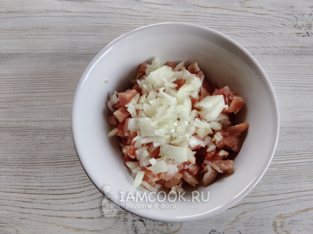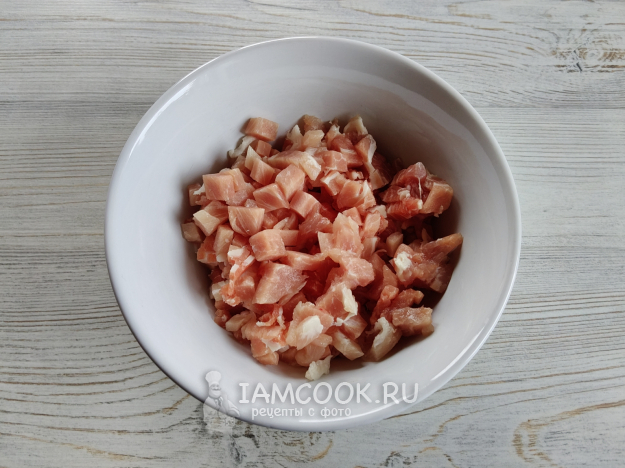 Нарезать мелкими кусочками мясо (подмороженное мясо режется лучше).