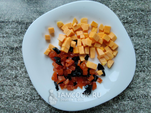 Промыть сухофрукты и также нарезать некрупными кусочками.