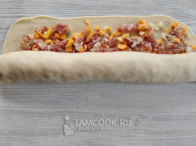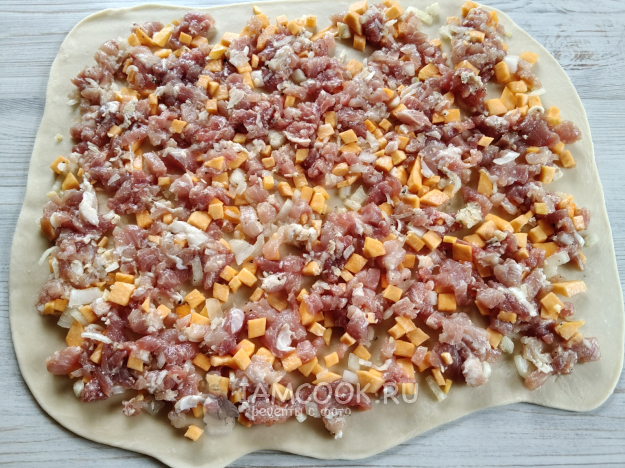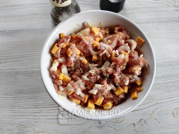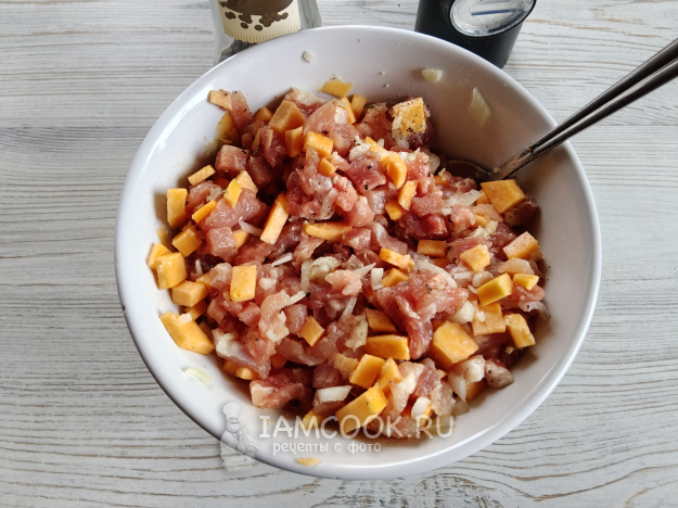 Для начинки нарезать кубиками мясо (подмороженное мясо резать удобнее).