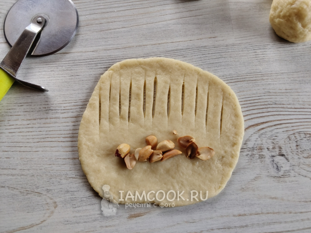 Раскатать тесто в тонкую лепешку. На край положить немного начинки.