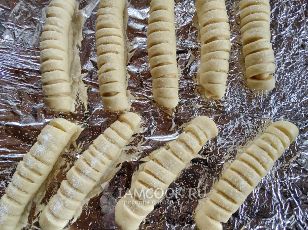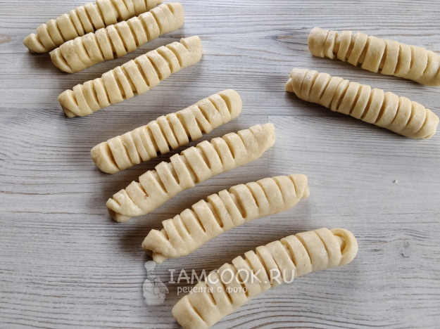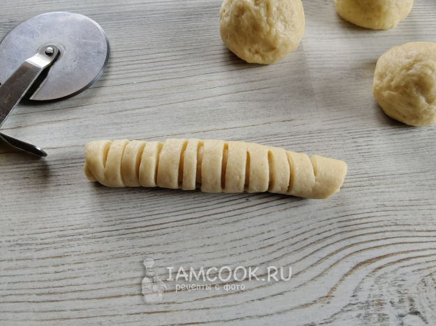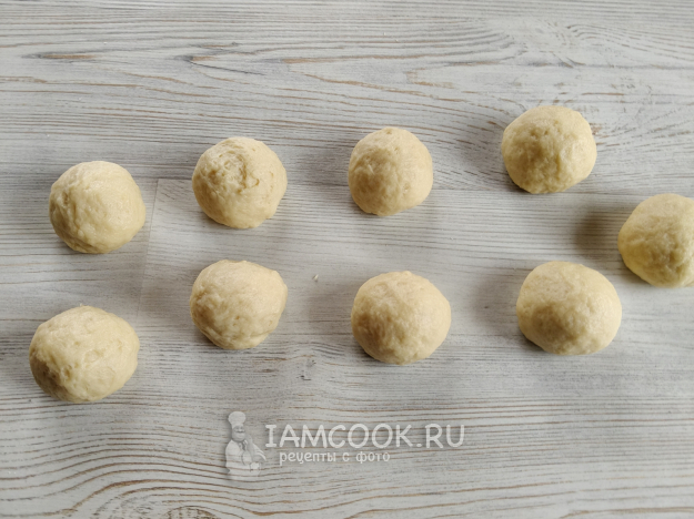 Дать тесту немного "отдохнуть". Разделить на одинаковые кусочки.