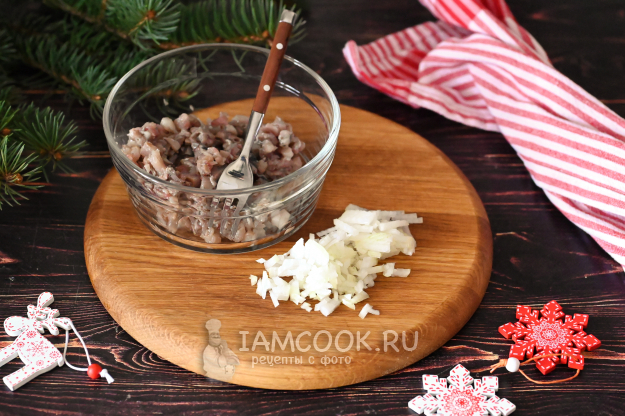 Также мелко-мелко нарубите лук и добавьте его к салаке.