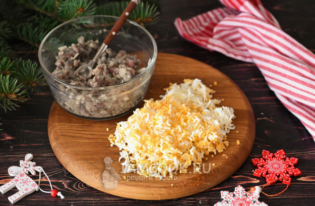 Яйца натрите на мелкой тёрке и добавьте в мисочку к остальным ингредиентам.