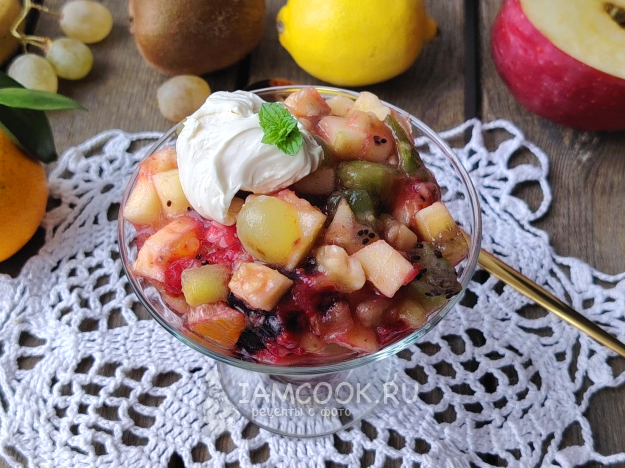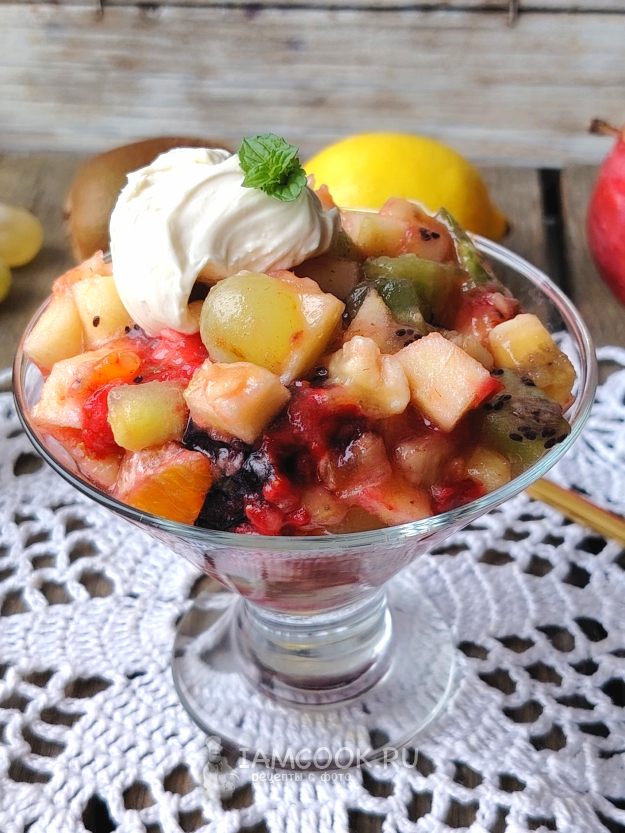 Наполнить салатом креманки. Украсить шариком густой (например, деревенской натуральной) сметаны или сливками, веточкой мяты, подать к столу. Долго салат «Фруктовая фантазия» в тепле держать не стоит, иначе фрукты пустят сок, соус станет жидким, а блюдо - менее вкусным. Приятного аппетита!