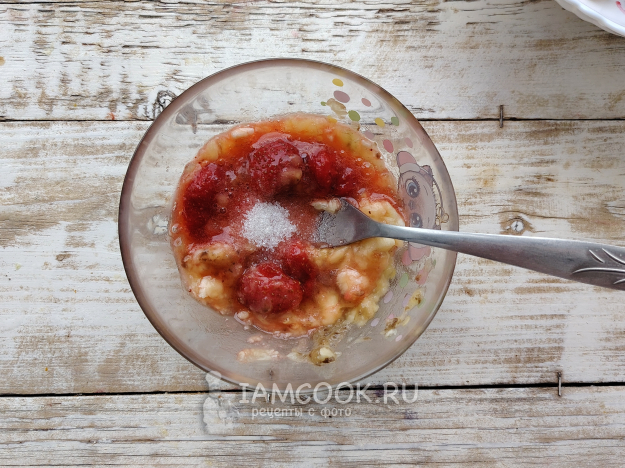 Оставшуюся клубнику и оставшуюся часть банана размять вилкой или пробить блендером до состояния пюре. Для аромата и улучшения вкуса можно добавить несколько листочков мяты и сахар.