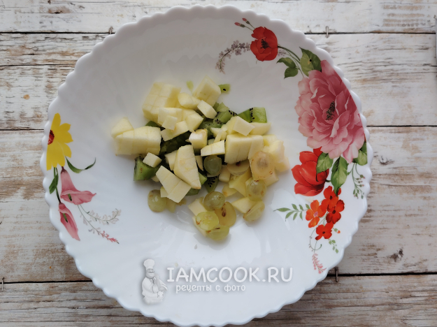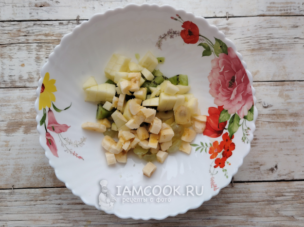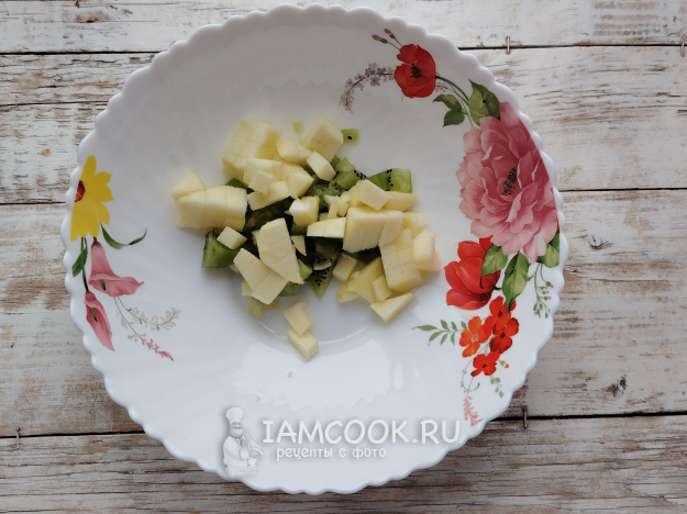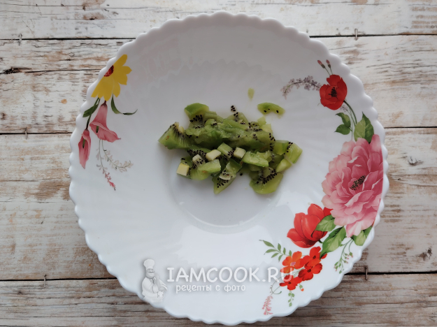 Фрукты помыть. С киви снять кожицу, мякоть нарезать кубиками.