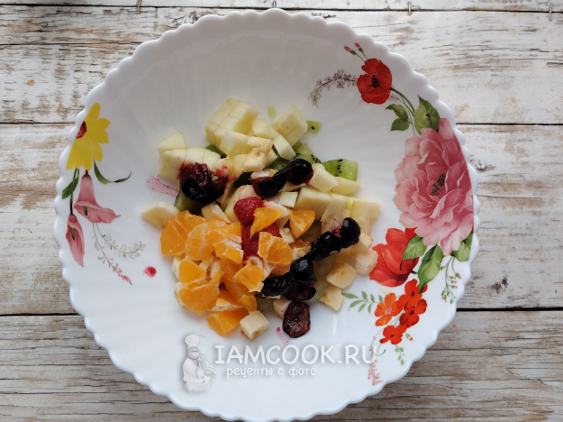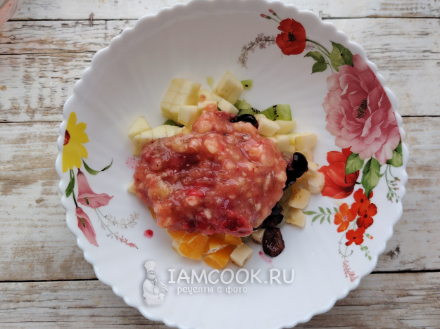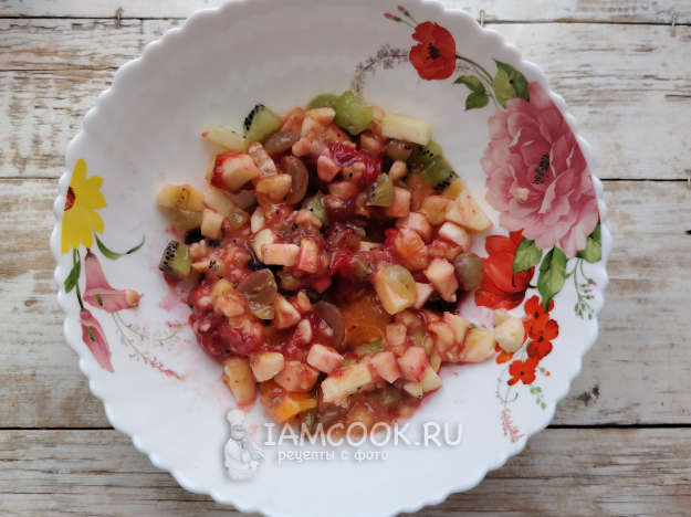 Фруктово-ягодным пюре залить фруктовую нарезку, перемешать.