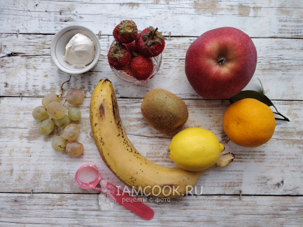 Собрать по списку продукты для салата «Фруктовая фантазия». Бананы должны быть хорошо спелыми, клубника подойдет замороженная (предварительно разморозить ягоды).