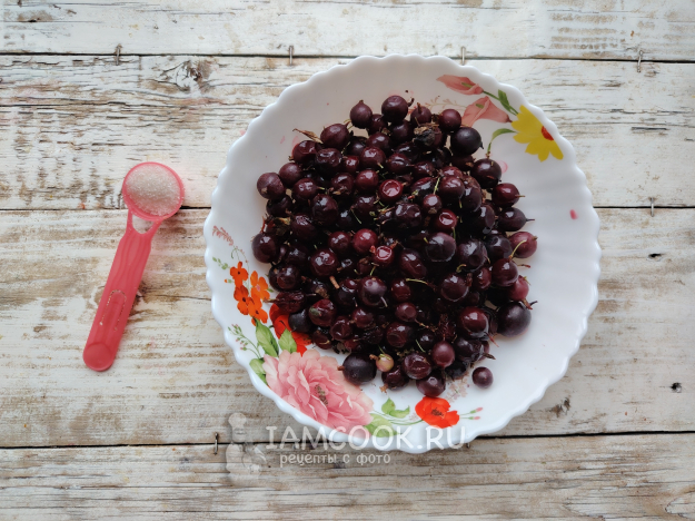 Собрать по списку продукты для приготовления желе из крыжовника на зиму по классическому рецепту. Желе даже проще готовить, чем варенье из крыжовника, потому что не нужно возиться с отрыванием хвостиков у ягод. Крыжовник можно использовать не только свежий, подойдет и замороженный. Форма целых плодов здесь не нужна.