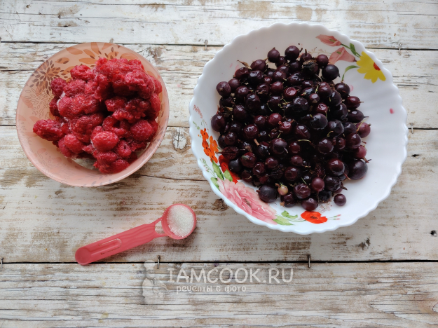 Собрать по списку продукты для приготовления желе из крыжовника и малины на зиму. Ягоды можно использовать как свежие, так и замороженные, предварительно дав им оттаять.