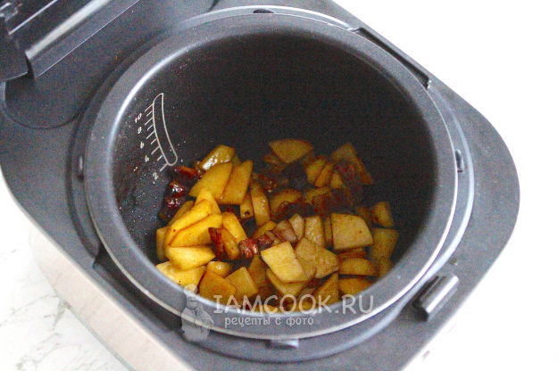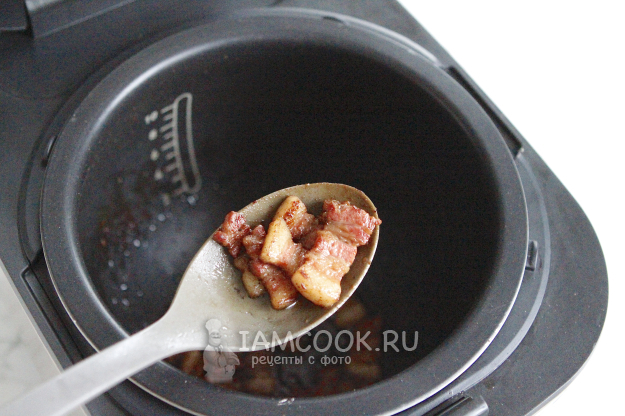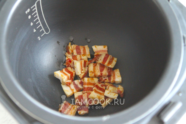 В чашу мультиварки переложите сало и обжарьте его до состояния шкварок.